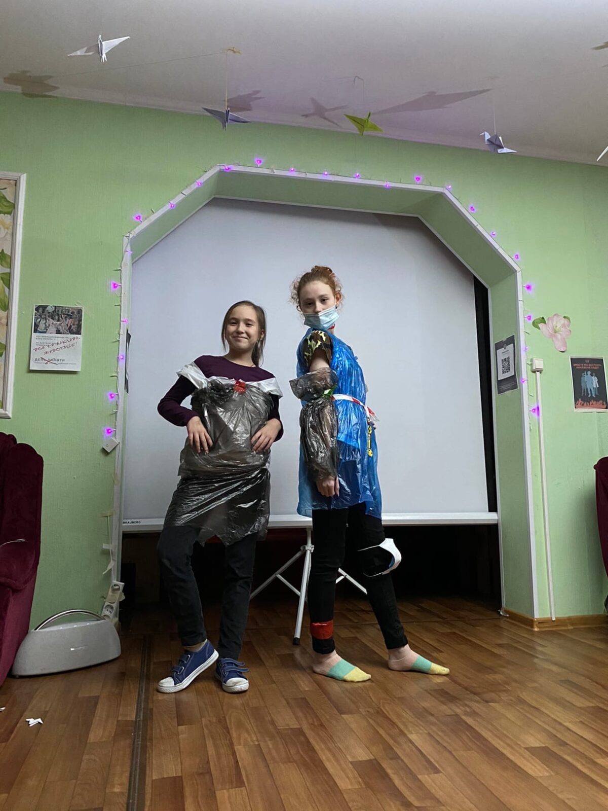 После ужина у нас очень творческое дело, в котором мы разделились на две команды, и каждая должна была создать карантинный костюм из подручных материалов (бумаги, пакетов и т.д.), а потом поменяться им с другой группой.