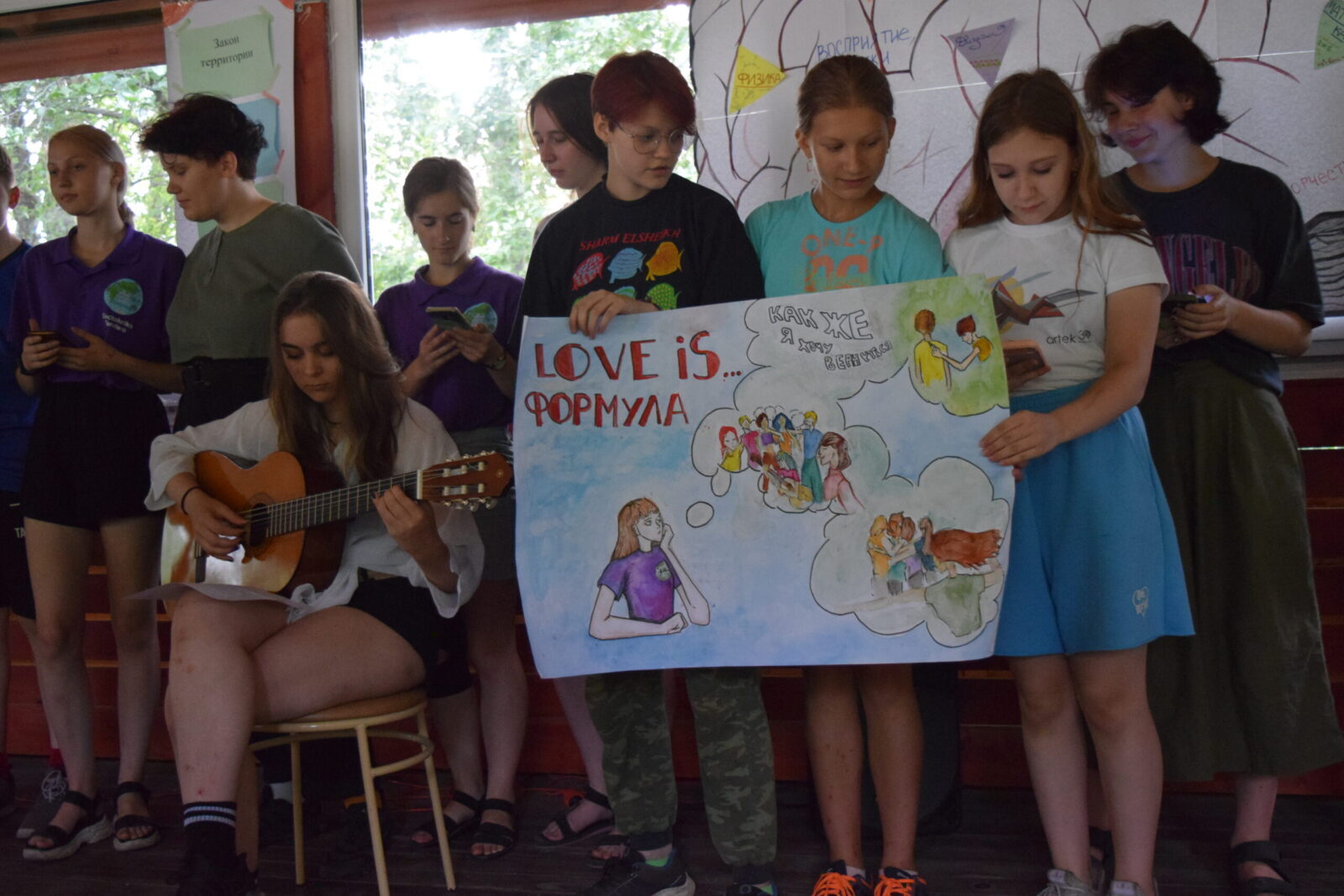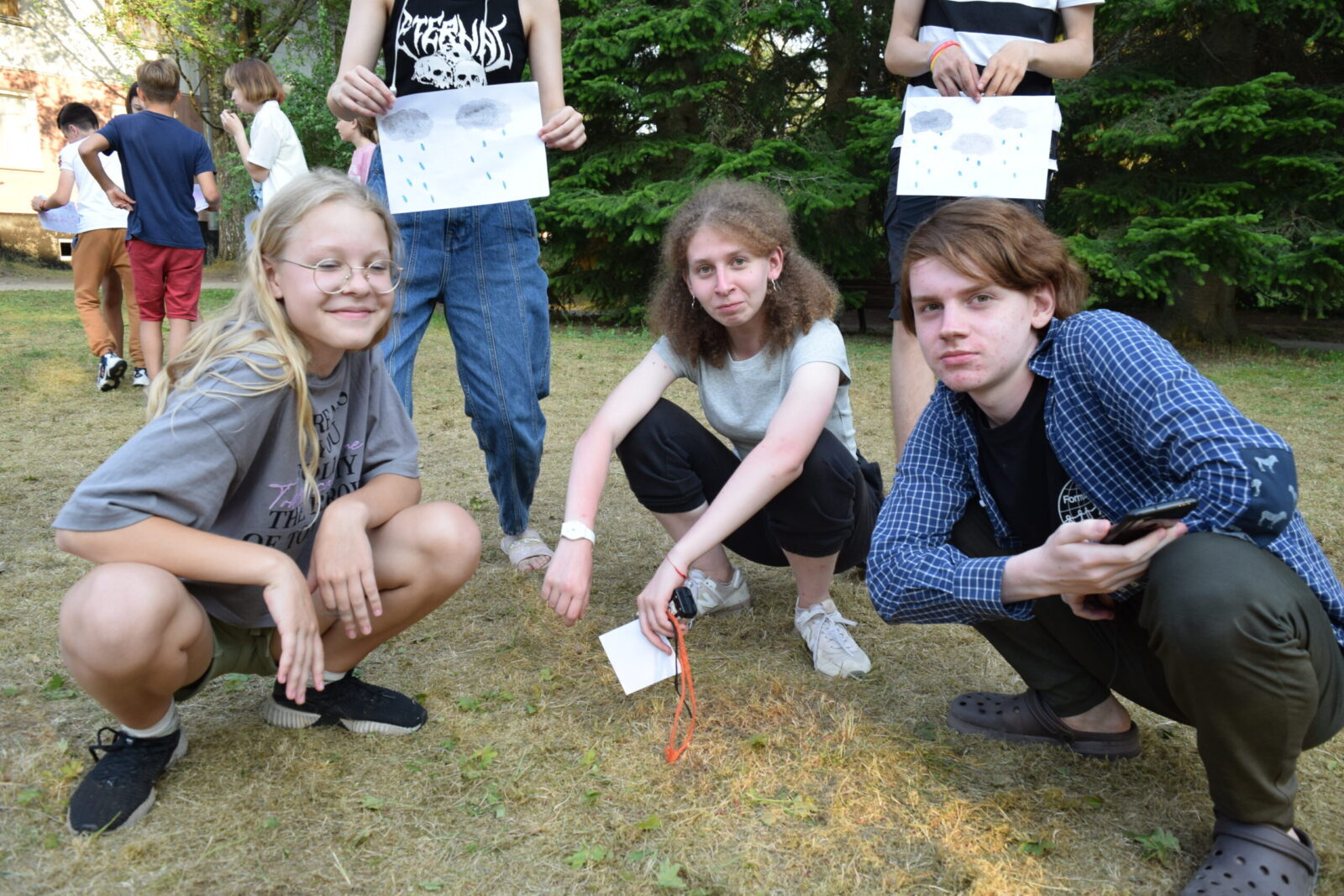 После обеда все атмосферно провели время с отрядами, где спели песни, а некоторые поздравили именинников. На квесте ребятам предстояло собрать человеческие эмоции, выполняя различные задания. После чего, объединившись разными отрядами, они придумывали творческие номера для вечернего дела.